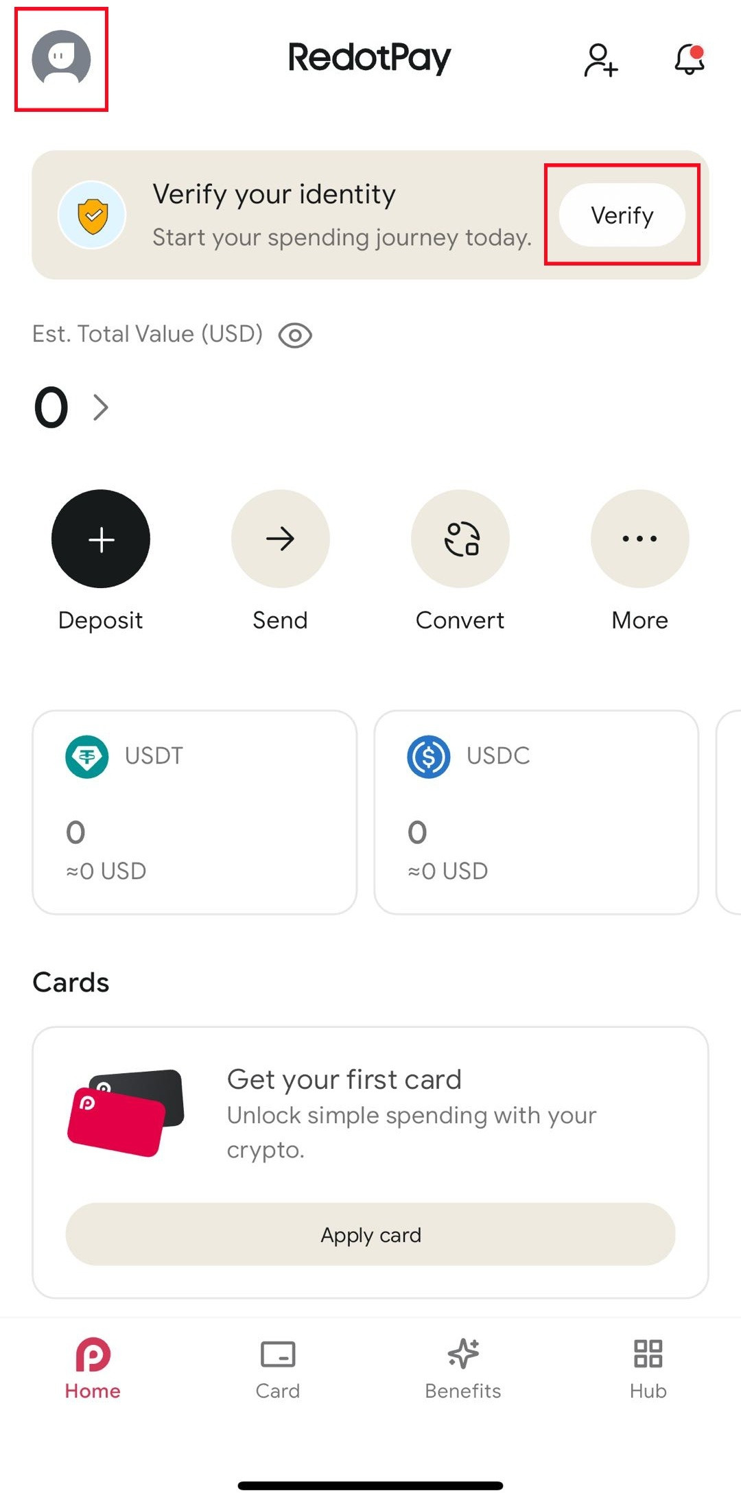 RedotPay 앱을 열고 왼쪽 상단 모서리에 있는 프로필 아이콘을 탭한 다음 이메일 주소를 선택하여 확인 페이지에 액세스합니다.